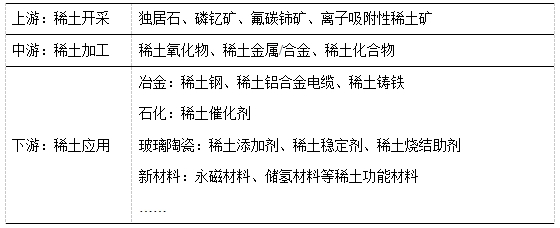 稀土產業鏈主要由稀土資源開采,稀土材料制備,以及稀土應用領域構成。其中:稀土資源開采主要涉及的稀土礦物有氟碳鈰礦、獨居石、磷釔礦,以及離子吸附性稀土礦;稀土材料制備包括精礦分解以及冶煉;稀土應用領域包括冶金、軍事、石化、玻璃陶瓷、農業、新材料等領域,是我國關鍵的戰略性資源。